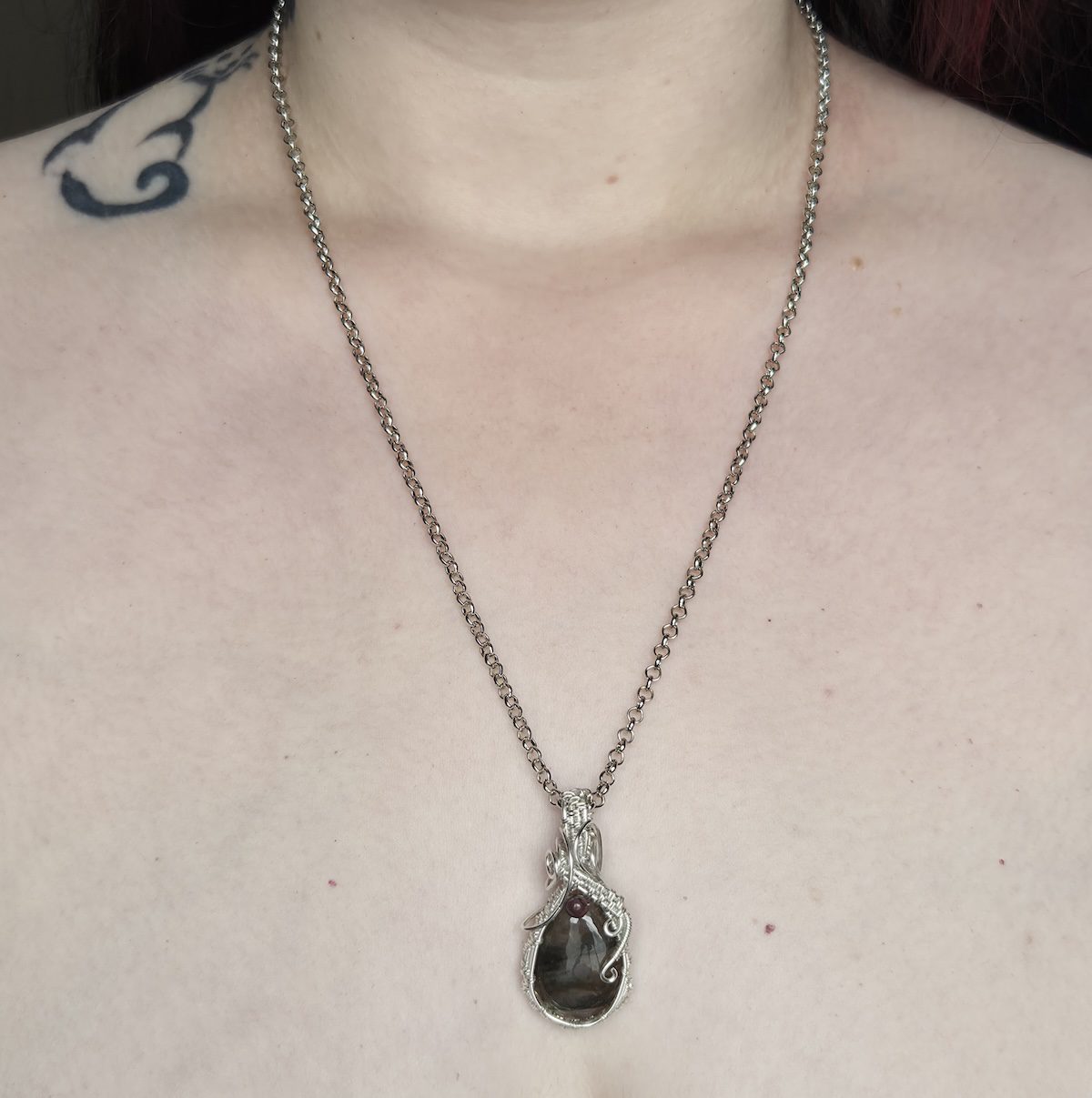 Wrapped in silver-plated copper to give it a cooler, more celestial feel. Finished with a small aqua jasper bead at the top, adding a subtle pop of colour that pulls through the tones in the stone.