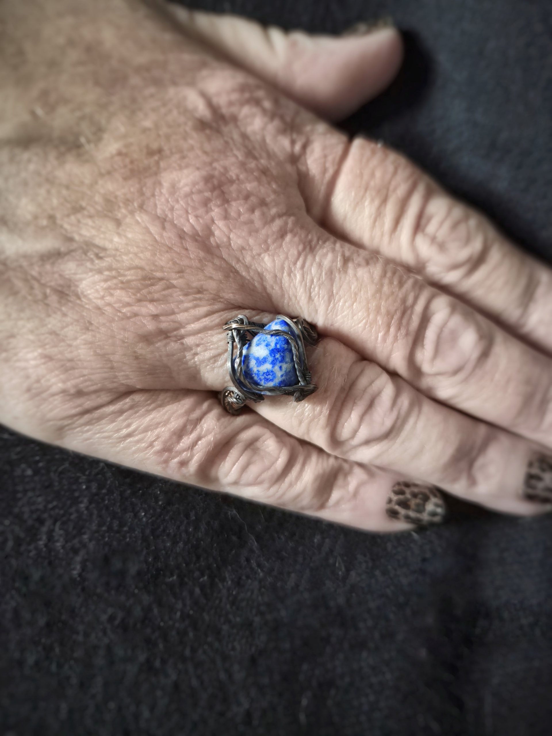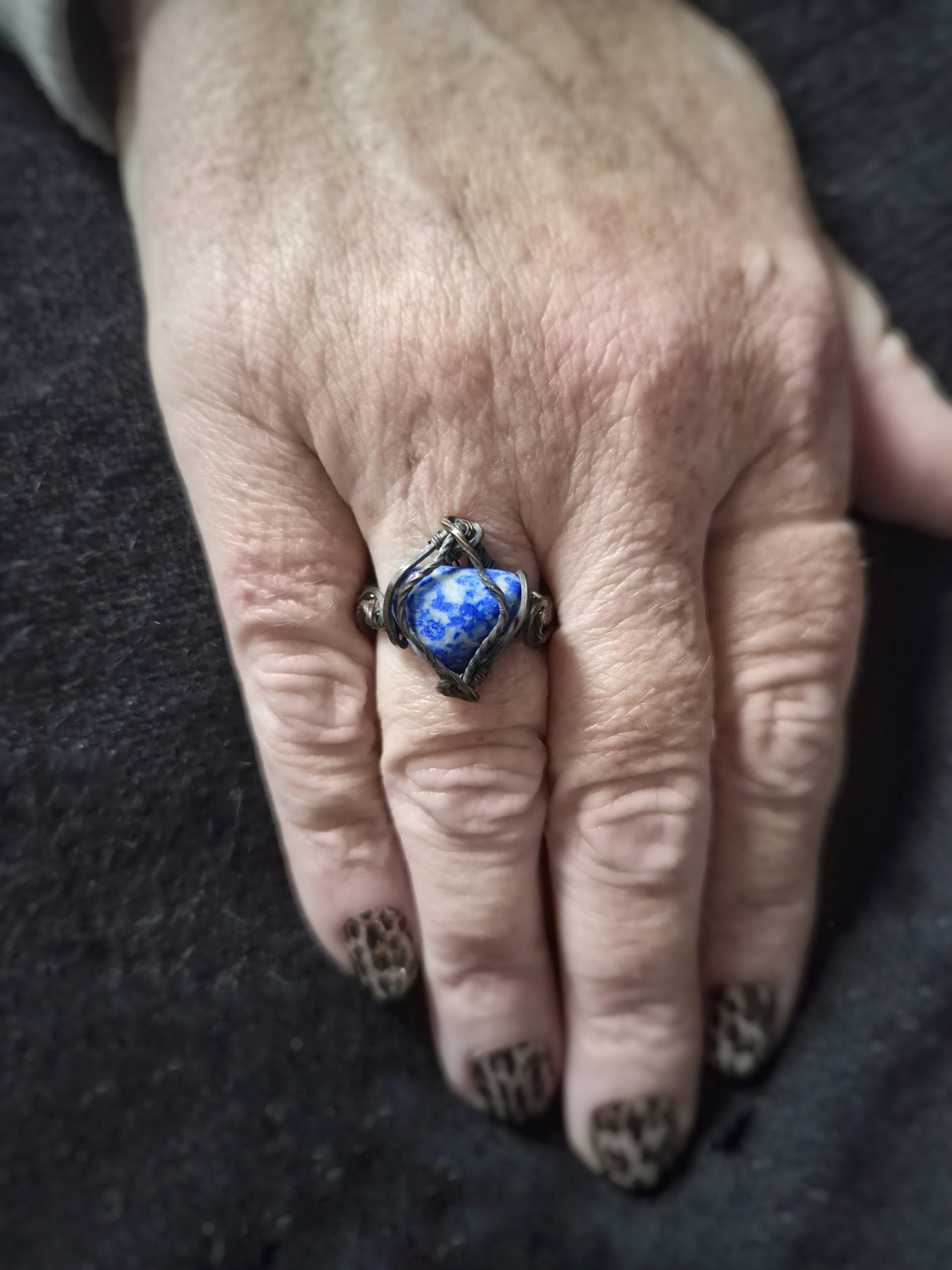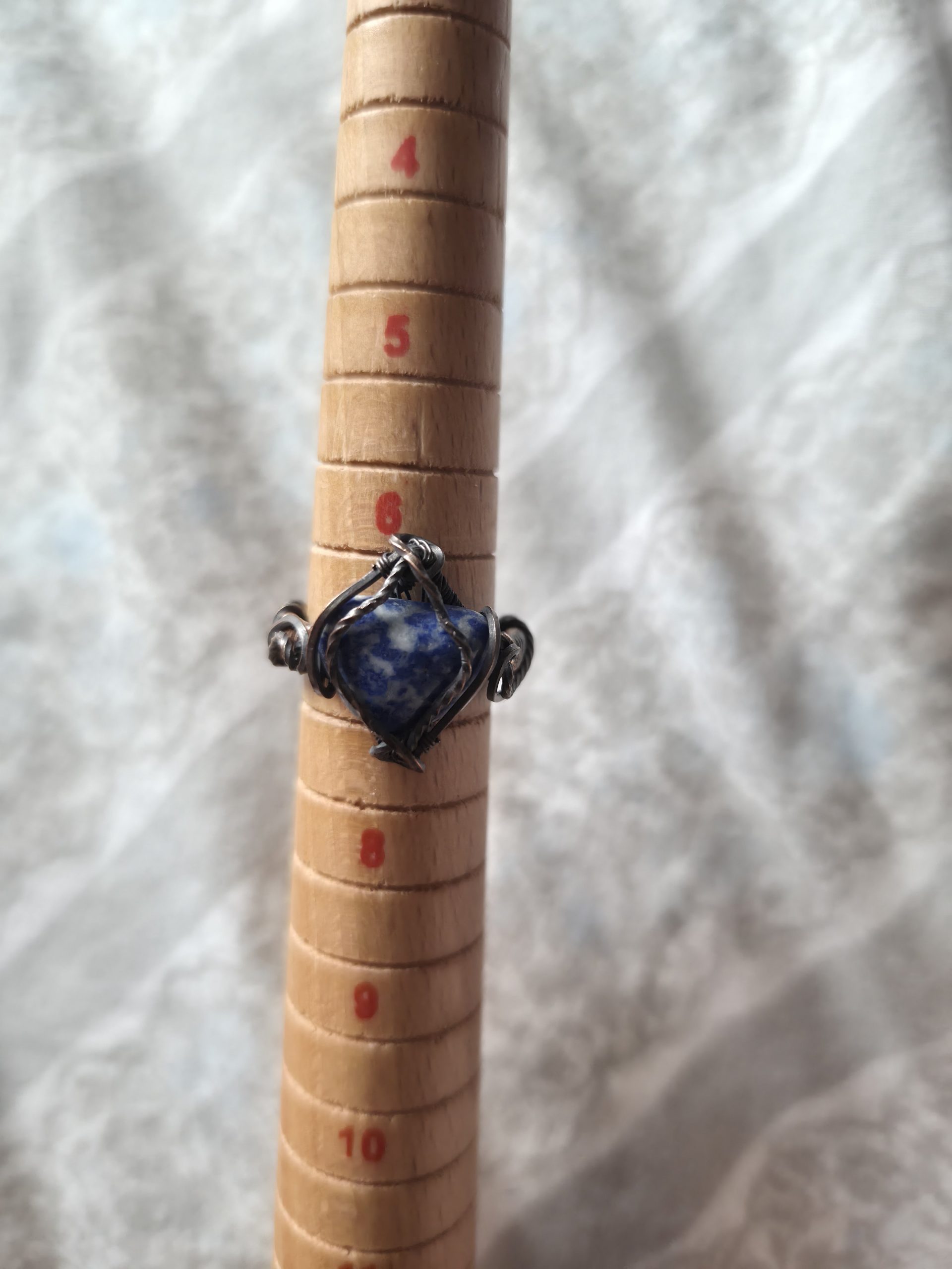 The sodalite stone blends midnight blue with streaks of white, held in a tight copper wrap.